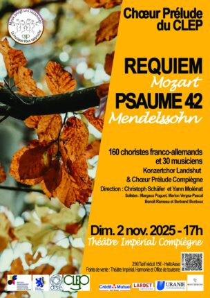 Le concert du 2 novembre 2025 à Compiègne a été l’aboutissement du projet du CLEP « La musique nous rapproche ». Le chœur Prélude de Compiègne avait été accueilli au printemps par le Konzertchor à Landshut où les deux chœurs se sont réunis pour un premier concert. Cette fois c’est dans le cadre du Théâtre Impérial de […]