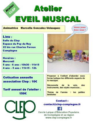 Retour en images sur la porte ouverte organisée par l’atelier éveil musical Pour rejoindre l’atelier Eveil Musical à la rentrée de septembre : Adhésion au CLEP 12€ Tarif annuel de l’atelier 150€