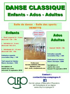 Publié le22 SEP Danse classique pour les ados et les adultes Les cours sont assurés par Estrella SERRANO RECUERO professeur diplômée d'état. Tarif de l'atelier : Adhésion au CLEP :...