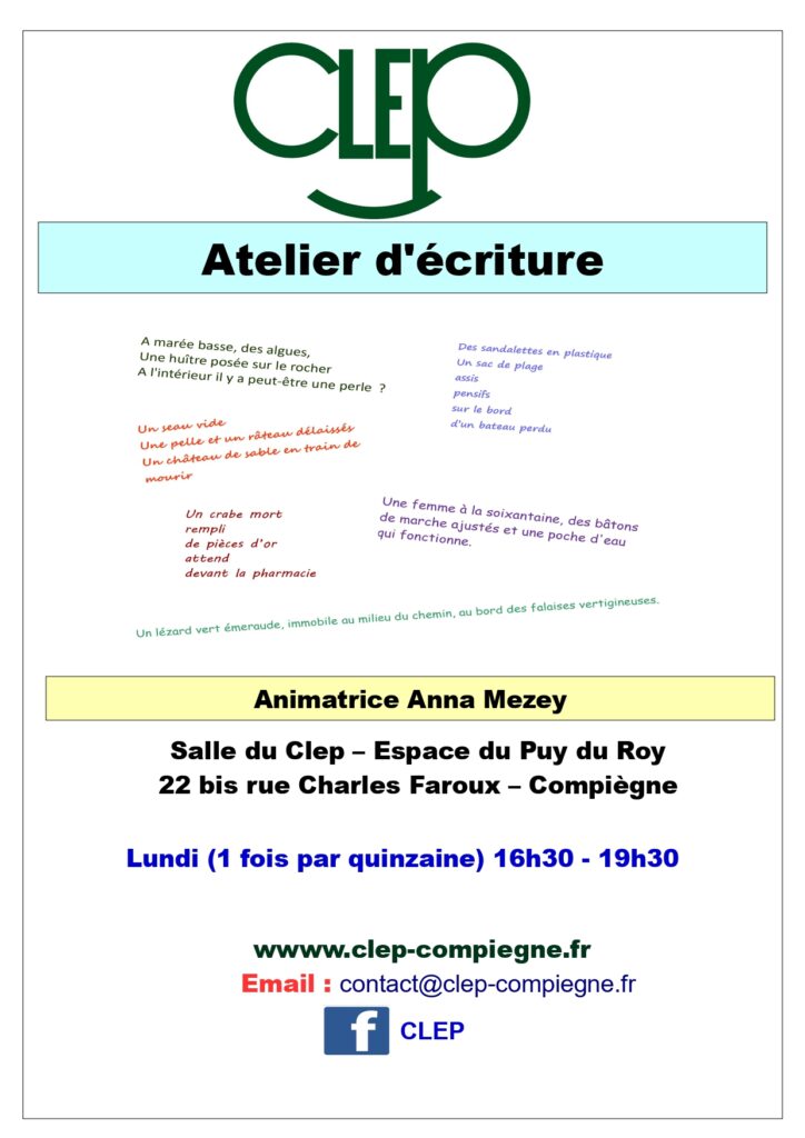 Publié le09 AOûT Rentrée à l’atelier d’écriture Reprise de l’atelier le lundi 5 septembre 2022 Tarif : 345€ Adhésion au CLEP :...
