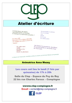 Tarif de l’atelier : Adhésion au CLEP : 25€ Tarif annuel de l’atelier d’écriture : 360€
