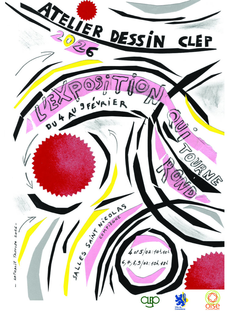 « L’exposition qui tourne en rond », exposition des dessins et peintures de l’atelier dessin du Clep, se tiendra aux salles Saint-Nicolas, rue Jeanne d’Arc à Compiègne :
