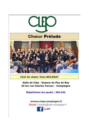 Les répétions du chœur reprennent début septembre en vue du concert du 2 novembre 2025 Première répétition jeudi 4 septembre 2025 Adhésion au CLEP 25€ Tarif annuel de l’atelier 150€